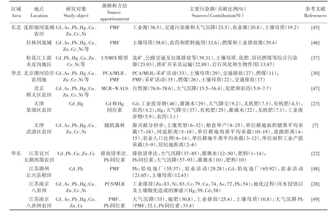 關(guān)于華北地區(qū)土壤重金屬源解析的近期文章共發(fā)現(xiàn)了13篇,涉及北京、天津、河北、山西和內(nèi)蒙古地區(qū)的2831個表層土壤樣品,所采用的定性源解析方法主要為PCA、相關(guān)性分析、空間分析等,定量源解析方法有PMF、PCA-MLR、同位素比值法等(表3)。總體上,華北地區(qū)農(nóng)田土壤中的主要污染重金屬元素是Cd,其次有Cu、Hg、Zn、Pb等。該地區(qū)農(nóng)田土壤中的As、Cr、Ni主要受土壤母質(zhì)的控制,個別地方的As還有采礦活動和大氣沉降的貢獻;除此以外,其余重金屬元素都受到一定程度的外源污染。Cd、Cu和Zn的污染來源仍以農(nóng)業(yè)活動(肥料、農(nóng)藥、灌溉水)為主,部分地區(qū)Cd還受到工業(yè)活動的影響。對于Pb的來源,土壤母質(zhì)、采礦活動、大氣沉降、污水灌溉等都有一定程度的貢獻。Hg主要受大氣沉降和灌溉水控制,局部地區(qū)有工業(yè)活動的影響。對于工業(yè)區(qū)周邊的非農(nóng)田土壤來說,重金屬的累積明顯與工業(yè)活動、燃煤、交通排放緊密相關(guān)。