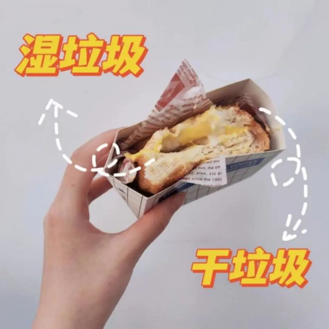 沒吃完的:吃剩的三明治——倒進濕垃圾桶;包裝紙——扔進干垃圾桶