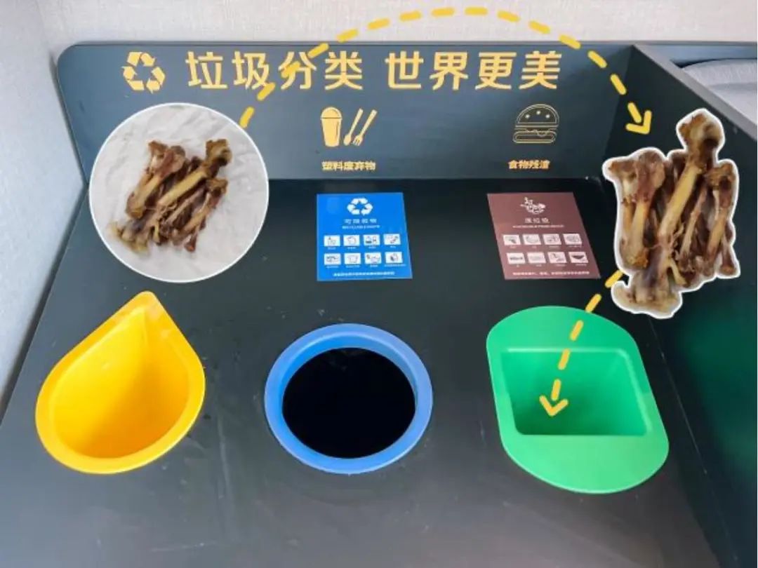 吃完了的:雞骨頭——扔進濕垃圾;包裝紙——扔進干垃圾桶