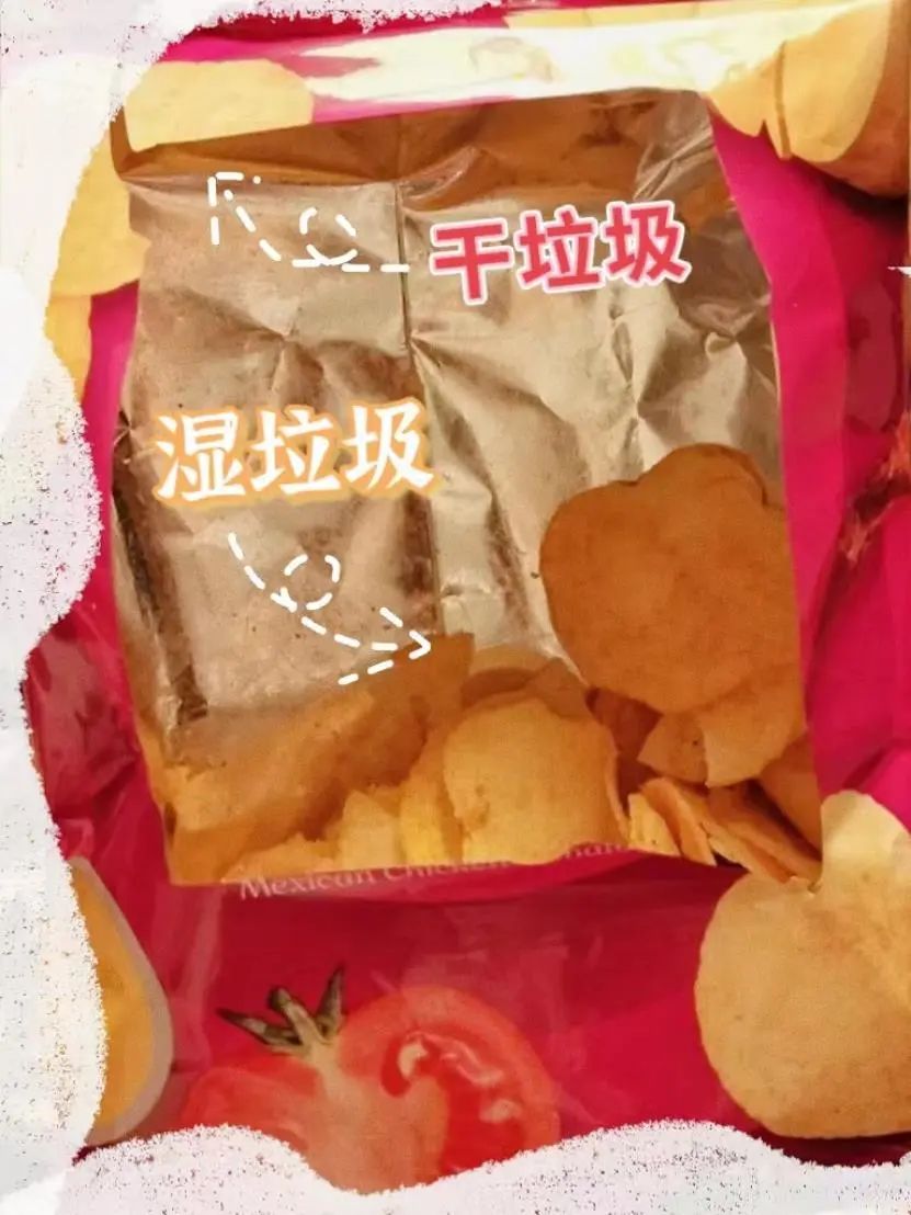 沒吃完的:吃剩的薯片——倒進濕垃圾桶;包裝袋——扔進干垃圾桶