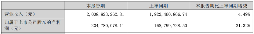 公司上半年?duì)I業(yè)收入為20.09億元,同比增長4.49%;歸屬于上市公司股東的凈利潤為2.05億元,同比增長21.32%。
