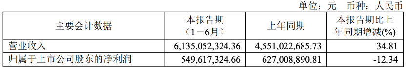 公司上半年?duì)I業(yè)收入為6,135,052,324.36元,同比增長34.81%;實(shí)現(xiàn)歸屬于上市公司股東的凈利潤為549,617,324.66元,同比下降12.34%。