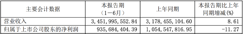 公司上半年度實(shí)現(xiàn)營業(yè)收入3,451,995,552.84元,同比增長8.61%;實(shí)現(xiàn)歸屬于上市公司股東的凈利潤935,684,404.39元,同比下降11.27%。