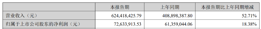 公司上半年?duì)I業(yè)收入為6.24億元,同比增長52.71%;歸屬上市公司股東的凈利潤7263萬元,同比增長18.38%。