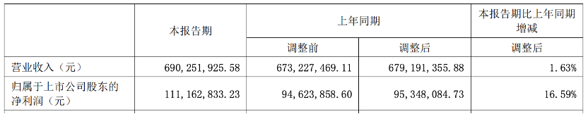 公司上半年?duì)I業(yè)收入為入6.90億元,同比增長1.63%;歸屬于上市公司股東的凈利潤1.11億元,同比增長16.59%。
