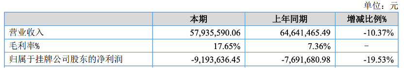 公司上半年?duì)I業(yè)收入為57,935,590.06元,同比下降10.37%;歸屬于掛牌公司股東的凈利潤-9,193,636.45元,同比下降19.53%。