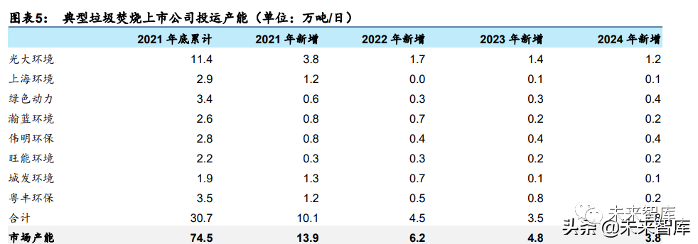 同時(shí),我們選取光大環(huán)境等 8 家典型垃圾焚燒上市公司,根據(jù)我們對(duì)投產(chǎn)項(xiàng)目的統(tǒng)計(jì)和對(duì) 在建項(xiàng)目的投產(chǎn)進(jìn)度預(yù)測(cè),8 家典型公司 2021-2024 年新增投運(yùn)產(chǎn)能合計(jì) 10.1/4.5/3.5/2.8 萬(wàn)噸/日,2021 年垃圾焚燒市場(chǎng)新增投運(yùn)產(chǎn)能 13.9 萬(wàn)噸/日。假設(shè) 2022-2024 年市場(chǎng)與典型 公司新增投運(yùn)產(chǎn)能之比維持 2021 年水平,測(cè)算得到 2022-2024 年市場(chǎng)新增投運(yùn)產(chǎn)能為 6.2/4.8/3.8 萬(wàn)噸/日,與自上而下測(cè)算結(jié)果基本一致,從而驗(yàn)證 2022-2024 年市場(chǎng)新增投運(yùn) 產(chǎn)能將明顯回落。