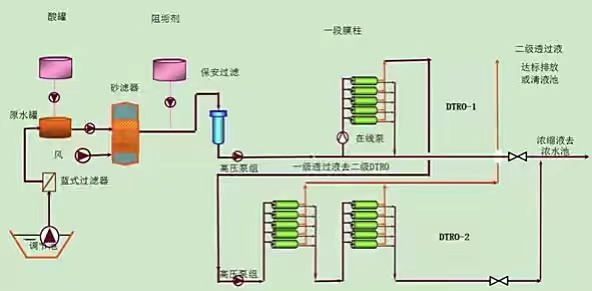 垃圾堆上滲下的滲濾液首先抽到調(diào)節(jié)池,然后從調(diào)節(jié)池抽到藍(lán)式過濾器將飛蟲等過濾,之后進(jìn)入原水罐,原水罐里面自動(dòng)添加硫酸調(diào)節(jié)酸堿度,此時(shí)硫酸和原水反應(yīng)過程中會(huì)生成硫化氫氣體。原水進(jìn)水泵將調(diào)節(jié)好的原水經(jīng)高壓泵打到膜柱過濾,產(chǎn)生的清水進(jìn)入清水罐,經(jīng)過大流量濾芯吸附氨氮、硫化物等后,再經(jīng)離交罐(又名樹脂罐)二次吸附氨氮、硫化物,然后排放至清水池,由水處理站排放。同時(shí)將吸附過濾后剩下的濃縮液打到濃水罐,用濃水泵抽到垃圾堆上,重新滲下循環(huán)處理。