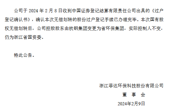 菲達(dá)環(huán)保發(fā)布公告稱,2024年2月8日收到中國(guó)證券登記結(jié)算有限責(zé)任公司出具的《過(guò)戶登記確認(rèn)書》,確認(rèn)本次無(wú)償劃轉(zhuǎn)的股份過(guò)戶登記手續(xù)已辦理完畢。