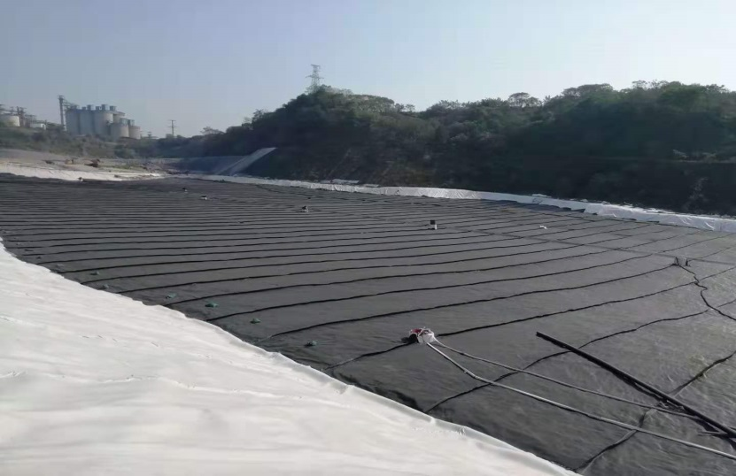 本項目最終形成的垂直分區(qū)結(jié)構(gòu)層如圖3所示:在整形壓實后的生活垃圾堆體之上依次構(gòu)建固化/穩(wěn)定化飛灰填埋區(qū)的地基處理層、防滲結(jié)構(gòu)層、滲瀝液導排層,并在滲瀝液導排層之上設(shè)置了HDPE土工膜作為雨污分流膜。其中,本項目創(chuàng)新性地將現(xiàn)有生活垃圾填埋氣導排層和新建固化/穩(wěn)定化飛灰?guī)靺^(qū)地基處理結(jié)合起來,通過在碎石加筋墊層中設(shè)置橫向的填埋氣導排管網(wǎng)既起到了加強填埋氣導排的作用,又可以有效防止生活垃圾堆體的不均勻沉降導致的飛灰?guī)靺^(qū)防滲膜滲漏等影響飛灰安全填埋的問題。固化/穩(wěn)定化飛灰采用晴天填埋雨天不填埋、分區(qū)分單元填埋的方式,填埋時揭開雨污分流膜,填埋完成后將雨污分流膜焊接好,以此,將飛灰滲瀝液的產(chǎn)量控制到最低,產(chǎn)生的少量飛灰滲瀝液輸送至生活垃圾填埋場滲瀝液處理站協(xié)同處理。更多技術(shù)要點詳見專利《生活垃圾填埋場垂直分區(qū)結(jié)構(gòu)》(CN219503430U)。