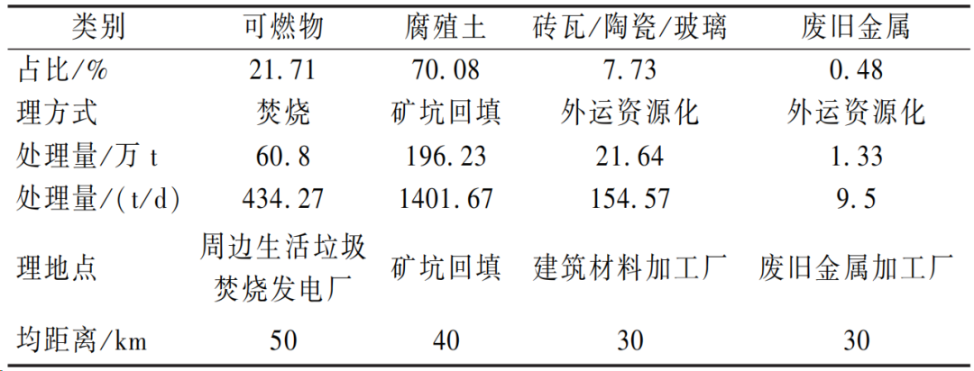 填埋場(chǎng)垃圾總量為 280 萬(wàn)t,其中紙類、橡塑類、紡織類、木竹類屬于可燃物,占比 21.71%,合 60.8 萬(wàn)t,磚瓦玻璃金屬為可直接資源化利用的比例為 7.73%,合 22.97 萬(wàn)t,混合類(腐殖土)占比 70.08%,196.23 萬(wàn)t(表4)。根據(jù)生活垃圾焚燒發(fā)電廠規(guī)模進(jìn)行反推,每天可處理可燃物 600 t,占處理規(guī)模的 21.71%,考慮不確定性因素,每天開挖和篩分規(guī)模定為 2000 t。