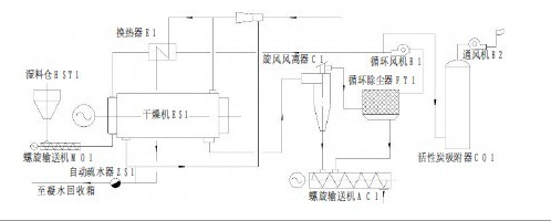 如圖1 ,污泥的蒸汽熱干化技術(shù)采用以工 業(yè)蒸汽為干燥介質(zhì),通過污泥干燥機(jī)將含水率 為7 0 % 的污泥經(jīng)螺旋輸送機(jī)(M01 )送達(dá)污泥 干燥機(jī)(ES1),來自工業(yè)用中壓蒸汽將乏氣(由 污泥干后形成的廢氣)加熱至110℃,送入干燥 機(jī)(E S 1 )的入口,與入口污泥進(jìn)行混合預(yù)熱, 同時(shí),在干燥機(jī)(ES1)筒體外殼內(nèi)通入工業(yè)用 中壓蒸汽,作為污泥干燥的主要熱源,采用與 污泥逆流換熱的方式進(jìn)行熱量傳導(dǎo),干燥后的 污泥與干燥過程中產(chǎn)生的乏氣一起進(jìn)入旋風(fēng)分 離器(C 1 ),其中9 5 % 以上的干燥污泥在旋風(fēng) 分離器(C 1 )中被分離,另外5 % 的污泥與乏 氣在布袋除塵器(F T 1 )中被收集,并共同進(jìn) 入螺旋輸送AC1 輸送出系統(tǒng);被分離出的乏氣, 一部分(約20%)進(jìn)入下一輪污泥干燥循環(huán),另 一部分(約80%)通過活性炭吸附器(CO1)除臭后排入大氣。