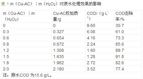 為了考察Cu -AC 與H2O2的協(xié)同作用,在m(H2O2) ∶m(COD) =1.4,反應(yīng)溫度為30 ℃的條件下,改變Cu-AC 投加量,試驗研究了m(Cu-AC)∶m(H2O2)對廢水處理效果的影響,結(jié)果見表 1。