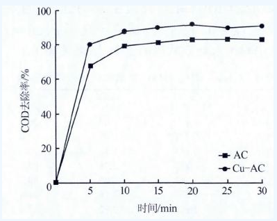 結(jié)果表明,Cu-AC 與AC 對COD 的去除率均隨時間的延長而提高,但Cu-AC 較AC 有更好的催化氧化效果,反應(yīng)30 min 時COD 去除率趨于穩(wěn)定。