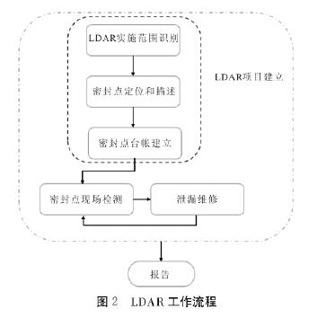 美國《石化企業(yè)泄漏檢測與修復工作指南》將LDAR工作流程劃分為LDAR項目建立、現(xiàn)場檢測和泄漏維修3個步驟,對其進行進一步拆解,可將LDAR工作流程劃分為LDAR實施范圍識別、密封點定位和描述、密封點臺賬建立、密封點現(xiàn)場檢測、泄漏點維修、出具報告6個步驟,如圖2所示。