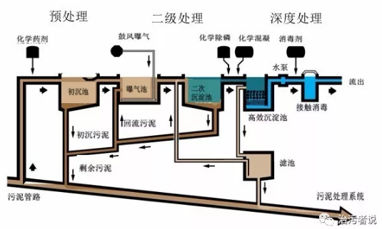一個(gè)采用活性污泥法的污水處理廠,一般有三個(gè)處理區(qū)域,為預(yù)處理段,二級(jí)處理段,深度處理段,在每個(gè)階段,都會(huì)產(chǎn)生不同的污泥,在上圖中我們可以看到,預(yù)處理段的初沉池會(huì)產(chǎn)生初沉污泥,在曝氣池和二沉池組成的生物處理系統(tǒng),會(huì)產(chǎn)生活性污泥的剩余污泥,在深度處理段,會(huì)產(chǎn)生化學(xué)藥劑產(chǎn)生的化學(xué)污泥,這些污泥通過地下管路的匯集,最終進(jìn)入到污泥處置單元,進(jìn)行污泥的處理。
