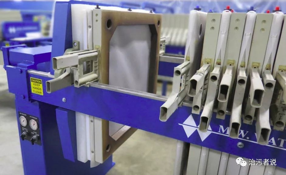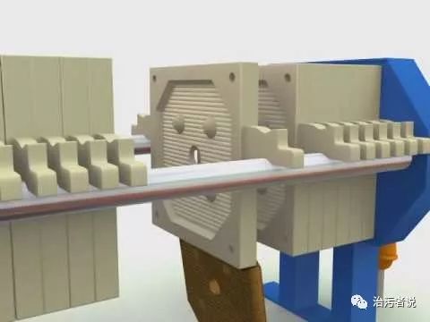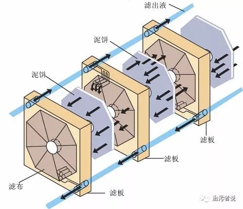 上圖可以看到濾布,濾板,泥餅,濾出液之間的關(guān)系??梢钥吹桨蹇蚴綁簽V機(jī)更像一臺(tái)不會(huì)轉(zhuǎn)動(dòng)的濾帶壓濾機(jī),通過(guò)固定在濾板上的濾布一次次擠壓,完成了污泥脫水的過(guò)程。