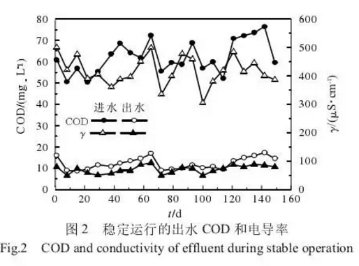 系統(tǒng)穩(wěn)定運行出水COD和電導(dǎo)率如圖2所示。