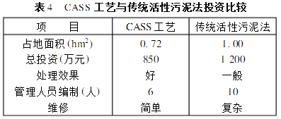 與傳統(tǒng)活性污泥法相比,CASS工藝具有占地少、投資省、管理運行方便、處理效率高等優(yōu)點,其投資比較示于表4(以Q=7200m3/d為例)。