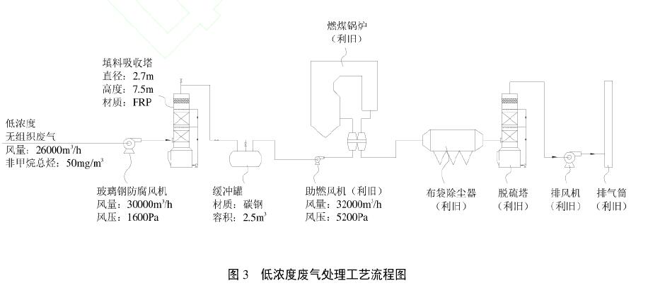 2)配料間、破碎間等局部區(qū)域換風(fēng)廢氣有具有風(fēng)量大、濃度低的特點(diǎn),經(jīng)水吸收預(yù)處理后可作為助燃?xì)饨尤肴济哄仩t進(jìn)行焚燒處理,燃煤鍋爐無(wú)需改造,助燃風(fēng)機(jī)和排風(fēng)機(jī)也能滿足要求,幾乎不影響燃煤鍋爐的運(yùn)行。