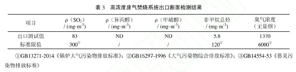 對(duì)于反應(yīng)釜、冷凝器出口的高濃度有機(jī)廢氣,改造方案先進(jìn)行水吸收或除塵預(yù)處理,再接入RTO爐,把異丙醇、甲硫醇等有機(jī)廢氣加熱到750~850℃,使廢氣中的有機(jī)物在氧化室氧化分解成CO2、SO2和H2O,最后經(jīng)一級(jí)堿吸收脫硫后排放。該工藝對(duì)異丙醇、甲硫醇等VOCs的凈化效率持久穩(wěn)定。焚燒系統(tǒng)出口(排氣筒高度25m)的檢測(cè)結(jié)果如表3所示,結(jié)果表明經(jīng)焚燒處理后,各類廢氣排放濃度、排放速率均達(dá)標(biāo)排放。系統(tǒng)設(shè)計(jì)風(fēng)量12000m3/h,總投資約182萬(wàn)元,投運(yùn)后運(yùn)行費(fèi)用合計(jì)為5182元/天,其中天然氣費(fèi)1200元/天,電費(fèi)1152元/天,藥品費(fèi)2830元/天。