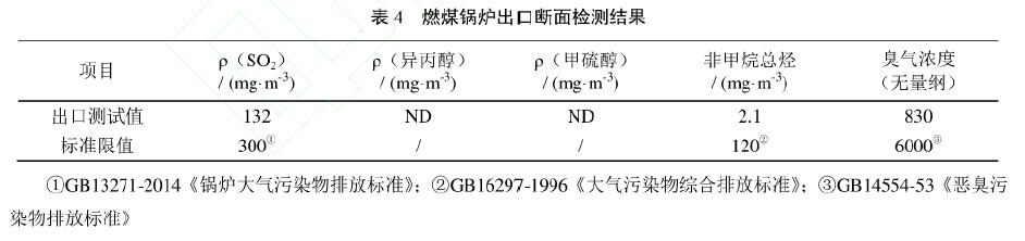 配料間、破碎間等的空間換風(fēng)有一定異味,換風(fēng)廢氣流量大,其中異丙醇等有機(jī)物濃度遠(yuǎn)低于爆炸極限的下限,改造方案采用水吸收進(jìn)行預(yù)處理,再作為補(bǔ)風(fēng)接入現(xiàn)有燃煤鍋爐經(jīng)1000℃左右高溫焚燒后排放。鍋爐排氣筒(高度25m)檢測(cè)結(jié)果如表4所示,結(jié)果表明利用燃煤鍋爐處理低濃度有機(jī)廢氣可有效控制異味污染。系統(tǒng)設(shè)計(jì)風(fēng)量26000m3/h,總投資約35萬(wàn)元,運(yùn)行費(fèi)為768元/天,主要為電費(fèi)。