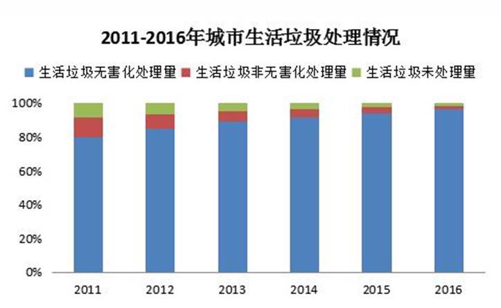 而在35%的要求之下,還存在著相當(dāng)高的生活垃圾處理率:《2017年全國大、中城市固體廢物污染環(huán)境防治年報(bào)》顯示,2016年,我國214個(gè)大、中型城市生活垃圾處理率達(dá)99.1%;《2016年城鄉(xiāng)建設(shè)統(tǒng)計(jì)公報(bào)》顯示,到2016年末,全國城市生活垃圾無害化處理率96.62%。