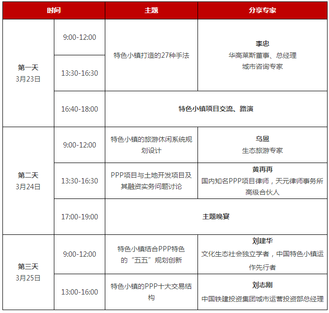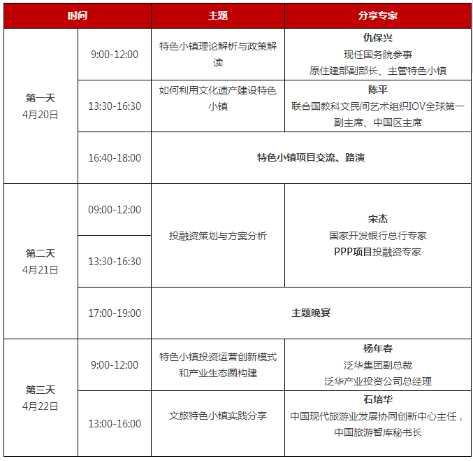 政策解讀、文旅特色小鎮(zhèn)實踐分享、投融資策劃與方案分析、特色小鎮(zhèn)投資運(yùn)營創(chuàng)新模式和產(chǎn)業(yè)生態(tài)圈構(gòu)建、如何利用文化遺產(chǎn)建設(shè)特色小鎮(zhèn)