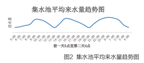 二十四小時(shí)平均進(jìn)水量趨勢圖如圖2所示,從圖可以看出,在早上7點(diǎn)左右進(jìn)水量逐漸增大,當(dāng)?shù)竭_(dá)十一點(diǎn)左右到達(dá)第一次峰值。這是由于人們早上用水量增大,通常情況下早上七點(diǎn)左右為用水高峰,而通過管網(wǎng)的延時(shí),導(dǎo)致進(jìn)水量在十點(diǎn)左右到達(dá)高峰。同樣的十三點(diǎn)和第二天零點(diǎn)分別是兩次進(jìn)水高峰。第三次高峰段的延長是由于這段時(shí)間人們生活所致,例如晚飯時(shí)間用水及洗澡時(shí)間的用水等造成水量的持續(xù)高峰。