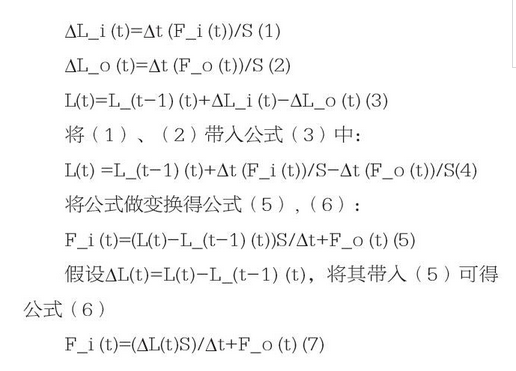 我們假設(shè)t時(shí)刻來水流量為Fi(t),集水池的液位就為L(t),S為集水池的底面積,膜進(jìn)水量Fo(t),ΔL_i(t)為來水液位增量,L_(t-1)(t)為t-1時(shí)的液位,ΔL_o(t)為超濾系統(tǒng)處理產(chǎn)量對業(yè)務(wù)液位增量??傻弥?/p>