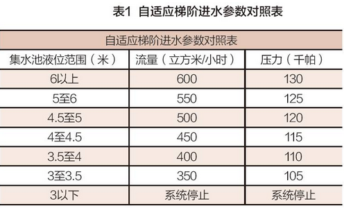 表1是本系統(tǒng)中梯階自適應(yīng)液位與流量壓力的參數(shù)對照表。這里的壓力與流量是對應(yīng)的,其壓力是根據(jù)膜的參數(shù)信息進(jìn)行對照查詢所得。液位與流量則是通過粗略計(jì)算和實(shí)驗(yàn)矯正所得。當(dāng)集水池液位大于6米時(shí),存在溢出風(fēng)險(xiǎn),這個(gè)時(shí)候系統(tǒng)滿負(fù)荷運(yùn)行。當(dāng)?shù)陀?米時(shí),為了防止提升泵干抽,我們將停止系統(tǒng)運(yùn)轉(zhuǎn)。