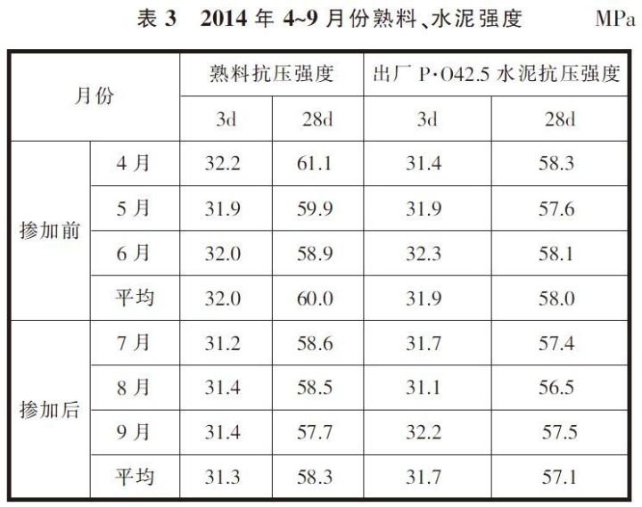 在生料中摻加污染土壤,造成生料易燒性的變化和有害成分的增加,對(duì)窯系統(tǒng)帶來(lái)一系列的不利影響,進(jìn)而導(dǎo)致熟料強(qiáng)度尤其是28d強(qiáng)度出現(xiàn)明顯下滑,同時(shí)對(duì)水泥強(qiáng)度尤其是28d抗壓強(qiáng)度造成一定影響,具體數(shù)據(jù)見(jiàn)表3。
