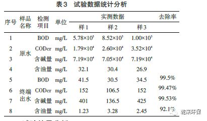 針對含堿廢水特點,采用了實驗室處理為試驗基礎(chǔ),在試驗取得成果的基礎(chǔ)上,開展工藝設(shè)計,綜合利用除油設(shè)備、高效蒸發(fā)設(shè)備、COD物化處理系統(tǒng)等工藝,在某煤制烯烴項目現(xiàn)場建設(shè)一套3m3/h處理能力的中試裝置,中試裝置建好投料后,很好地去除了廢水中的油類、鹽、堿及COD,提高了廢水的可生化性,滿足了后續(xù)生化工藝的進(jìn)水要求。