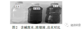 7.2 試驗結(jié)果分析:根據(jù)中試運行結(jié)果可知,72h 連續(xù)運行測定的COD值分別為152mg/L、106.5mg/L、152mg/L,遠(yuǎn)小于設(shè)計值600mg/L。處理程度較深,水中大部分有機物都得到了降解,工藝處理能力大大超過設(shè)計要求,中試裝置試驗結(jié)果也驗證了本含堿廢水處理工藝的成功。處理后與處理前水樣對比見圖2(左:出水、中:濃縮液、右:原水)。
