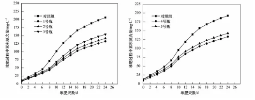 由圖3可知,前6d兩周期的揮發(fā)氨累積量沒有明顯的變化,但均呈現(xiàn)上升的趨勢,堆肥進(jìn)行第8d到第18d是氨氮損失量最大的區(qū)段,之后由于溫度降低,有機(jī)物的消耗以及微生物的活動減弱,氨氮損失量變小,慢慢趨向穩(wěn)定。未投加中藥渣時,對照組堆體的氨氮揮發(fā)累積量達(dá)到了206.5mg˙L-1,而1號瓶(60g中藥渣+300g污泥)堆體的氨氮揮發(fā)累積量僅為132.2mg˙L-1,與對照組相比減少了35.9%,原因在于微生物的固氮是需要碳源的,但城市污泥中的C/N往往不足,因此微生物的固氮能力差,導(dǎo)致了氮的損失嚴(yán)重;而中藥渣富含碳源,可以調(diào)整堆體的C/N,從而使微生物能更好的發(fā)揮其固氮作用。