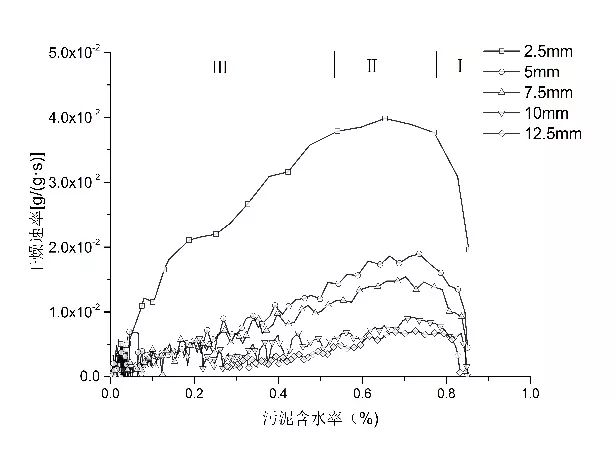 由圖3可知,污泥的干燥速率隨著含水率的變化而改變,大致可以分為:預干燥階段,恒速干燥階段和降速干燥階段。在含水率區(qū)間Ⅰ內(nèi),干燥過程處于預熱階段,隨著溫度提高,干燥速率有迅速增高的趨勢;Ⅱ區(qū)間內(nèi),加熱板輸出的熱量主要用于自由水的轉(zhuǎn)移與蒸發(fā),污泥表面的水分蒸發(fā)速率與污泥內(nèi)部水分擴散速率相當,干燥速率波動較為平穩(wěn),可近似看作恒速干燥;Ⅲ區(qū)間內(nèi),隨著含水率逐漸降低,污泥中的間隙水與吸附水開始減少,擴散阻力增加,干燥速率減慢,即降速干燥階段。