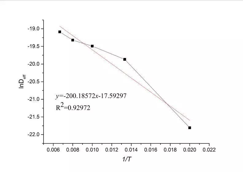 由式(7)可知,ln Deff與1/T成線性關系。由圖5可知,是直線的斜率,lnD0是直線的截距。經(jīng)計算,活化能Ea=1.664 kJ/mol,D0=2.288×10-8 m2/s。