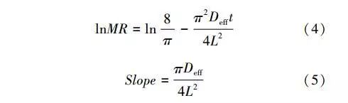 為方便研究,將上式進行線性轉(zhuǎn)化得式(4),可見,lnMR的值與干燥時間t成一次函數(shù)關系,由其斜率可以計算得到有效擴散系數(shù),即式(5)。
