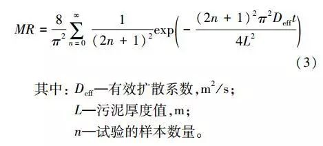 有效擴散系數(shù)污泥的干燥過程可以簡化為污泥內(nèi)部水分向外界的擴散過程,描述物質(zhì)擴散的Fick定律可用來計算污泥中水分的擴散系數(shù),擴散系數(shù)與溫度和含水率的關系由式(3)給出。