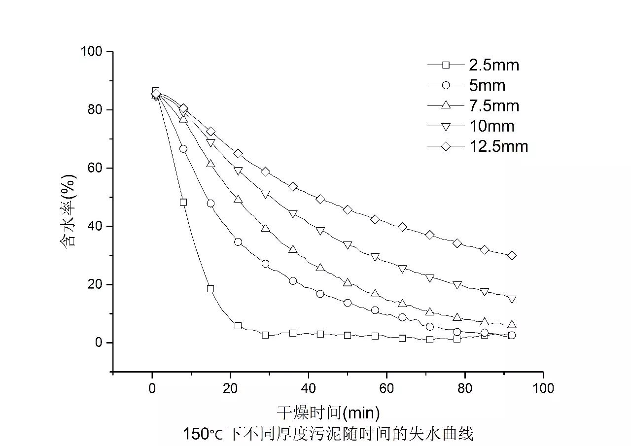 圖2 150 ℃不同厚度污泥的失水曲線