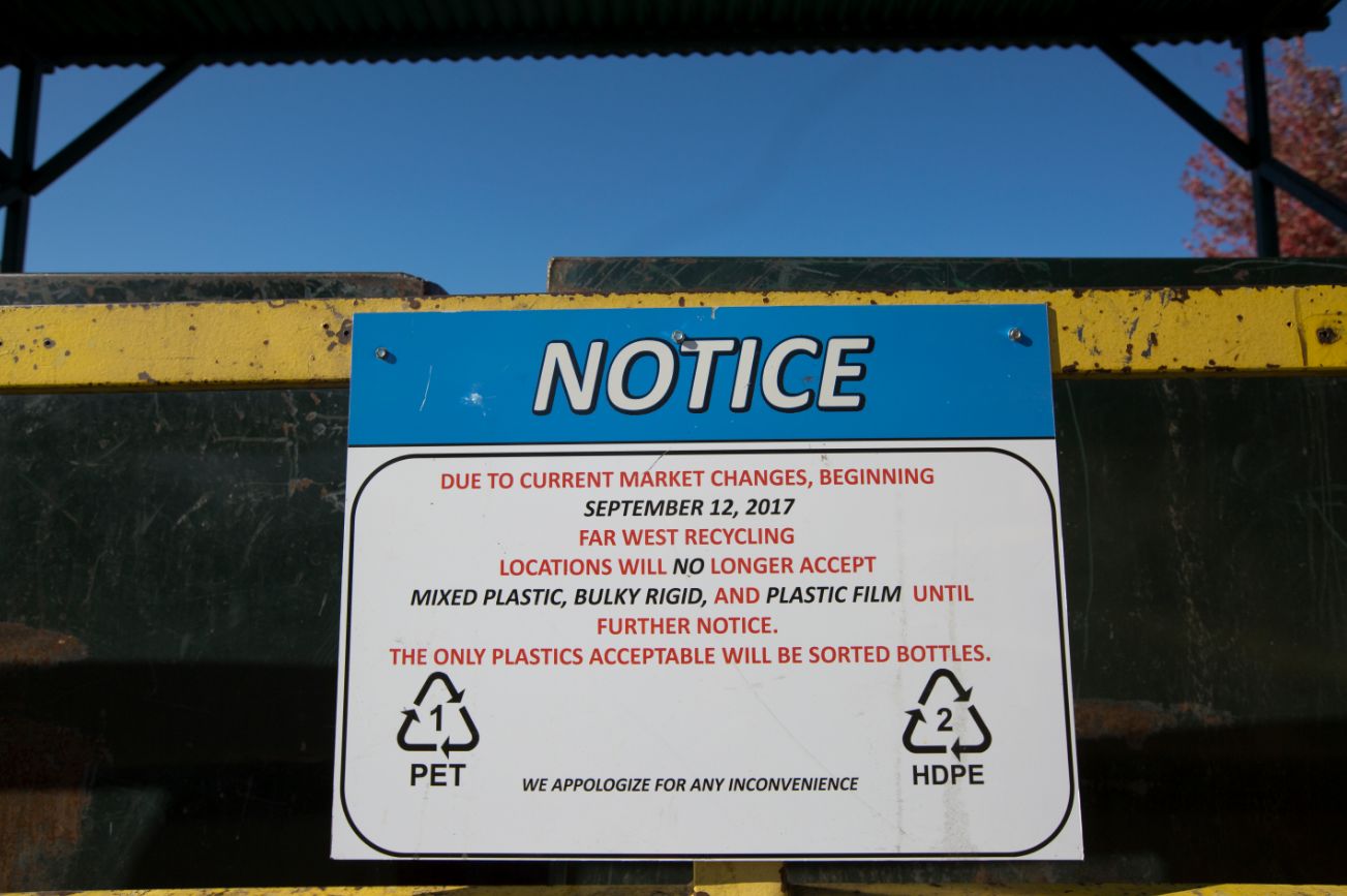 ▲美國(guó)希爾斯伯勒的垃圾回收站貼出了通知:因?yàn)槭袌?chǎng)變化,不再接收混合塑料等,唯一接收的塑料只是分選的塑料瓶。(視覺(jué)中國(guó)/圖)