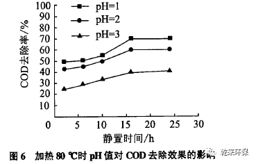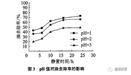 從圖3和圖4可以看出,加酸破乳比加熱破乳效果更明顯,油的去除率最高可以達(dá)到73%,COD的去除率可以達(dá)到64%。試驗(yàn)過(guò)程中加入硫酸調(diào)整pH值,加入酸后震蕩1 min,水面明顯出現(xiàn)一層油,但是比單純加熱產(chǎn)生的浮油顏色淺,呈黃色,這說(shuō)明加酸后破壞了乳化液,形成了有機(jī)酸而使油水分離。而且pH值越低,產(chǎn)生的浮油量越多,浮油出現(xiàn)的速度也越快。隨著靜置時(shí)間的增加,pH值越低錐形瓶?jī)?nèi)乳化液分層越明顯。靜置10 h以上,pH值為1、2的錐形瓶底部出現(xiàn)一層透明的清液,中間大部分是混濁的乳白色,上部一層黃色浮油,pH=3的錐形瓶底部沒(méi)有明顯的透明清液。建議酸化破乳pH值控制在1—2。