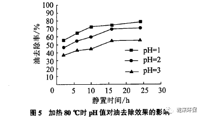 從加熱試驗(yàn)效果和加熱能耗兩個(gè)方面考慮,本次試驗(yàn)選擇加熱至80℃和加熱4 h來(lái)進(jìn)行破乳效果的觀察。從圖5和圖6的數(shù)據(jù)曲線對(duì)比圖3和圖4數(shù)據(jù)曲線可以看出,相同pH值條件下,加熱可以加速初期破乳,加熱后靜置2,6,10 h后破乳效果明顯優(yōu)于同pH值下不加熱破乳效果。但是靜置時(shí)間超過(guò)16 h以上后,相同pH值條件下,破乳效果同不加熱相比增加不多。