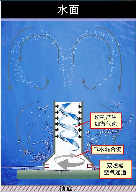 旋流曝氣器在工作過程中,氣體從底部法蘭口進入后從緊貼鐘型曲面的 2 個噴嘴噴出形成旋流效果,以極快的速度沿著鐘型壁面向上加速回旋。由于鐘型上側(cè)漸漸狹窄,空氣獲得極大的加速度和沖擊力。 由于氣體作用,混合液在筒內(nèi)、外循環(huán)流動,氣液上升過程中,被筒內(nèi)部結(jié)構(gòu)多次碰撞切割,形成大量超微氣泡,且與周圍的泥水混合物充分混合,增加了氧氣的傳質(zhì)速率和氧利用率;充分混合的氣水猛力向上沖出,強烈的循環(huán)水流使部分小氣泡和水流返回池底,同時使底部淤泥參與循環(huán),因而整個曝氣池內(nèi)無充氧盲區(qū),實現(xiàn)了曝氣池容積利用最大化。(見圖3)