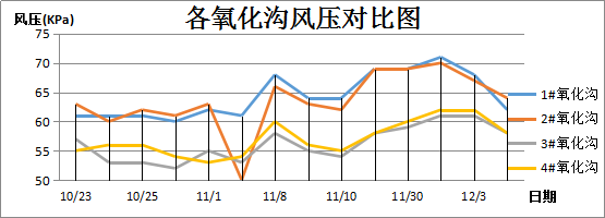 由表1、表2對比可知,旋流曝氣器,運行的風壓遠低于微孔曝氣器,相同的工況下,旋流曝氣器比微孔曝氣器低6KPa以上
