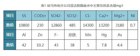 3.4 脫硫廢水:煙氣濕法脫硫過程產(chǎn)生的廢水來源于吸收塔排放水。為維持脫硫裝置將夜循環(huán)系統(tǒng)的物質(zhì)的平衡,需要定時從吸收塔排除廢水。我公司脫硫廢水中主要雜質(zhì)及其含量,PH值為6.7,其中有些物質(zhì)為國家環(huán)保標(biāo)準(zhǔn)要求嚴(yán)格控制的第一類污染物。具體指標(biāo)見下表。