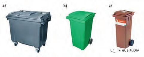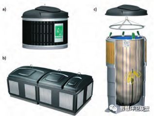為了進(jìn)行廢物的投放,產(chǎn)業(yè)所有者或物業(yè)管理公司應(yīng)當(dāng)為住宅提供生活垃圾的投放點(diǎn)。投放時(shí)采用的容器分為普通容器(更為常用)和埋入式容器(正在普及)兩種。常用的普通投放容器分別為140升(圖8中c)、240升(圖8中b)、600升(圖8中a)這三種。普通投放容器的缺點(diǎn)是,雖然容積不大,但卻會占據(jù)將對較大的空間。埋入式容器部分設(shè)置于地下,內(nèi)部配備高強(qiáng)度織物容納袋,容納能力遠(yuǎn)高于普通容器,能夠在節(jié)省空間的同時(shí),起到降低收運(yùn)頻次的作用。收運(yùn)時(shí),收運(yùn)車輛會將織物袋從容器中取出,通過打開袋底的機(jī)關(guān)清空廢物。
