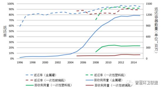 芬蘭的押金體系實(shí)現(xiàn)了極高的回收率。在PALPA體系剛剛成立的1996年,一次性金屬罐的回收率就已經(jīng)達(dá)到了59%,并馬上于第二年上升到了79%。到了2009年,金屬罐的回收率已經(jīng)超過90%。同樣地,PET瓶的押金體系在2008年開始實(shí)施時(shí),返還率就已經(jīng)達(dá)到了71%,之后在兩年內(nèi)便上升到了90%以上。玻璃瓶在芬蘭擁有很長的押金制度實(shí)施積累,因此在PALPA在建立針對玻璃瓶的回收體系后,回收率就一直高于80%。從圖11還可以看出,一次性鐵罐的回收量自2004年起至2012年,一直都在迅速上升,并且保持穩(wěn)定的高回收率,反映出芬蘭飲料產(chǎn)業(yè)使用一次性金屬罐替代可重復(fù)使用玻璃瓶的趨勢。可重復(fù)使用玻璃瓶的回收率則更高,在2014年時(shí)為97%、2015年時(shí)為98%。