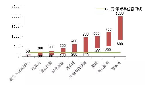 2015年10月9日在國(guó)務(wù)院例行政策吹風(fēng)會(huì)上,住建部已選擇16個(gè)城市開展“海綿城市”建設(shè)試點(diǎn),計(jì)劃3年內(nèi)投資865億元,建設(shè)面積450多平方公里,按此計(jì)算,每平方公里投資約1.9億元(折合190元/平米),而實(shí)踐中大部分海綿城市相關(guān)的低影響開發(fā)單項(xiàng)設(shè)施投資均在190元/平米之上(圖1)。