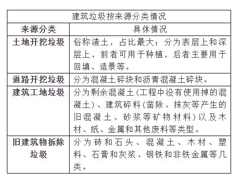 建筑垃圾的產(chǎn)生主要是在建筑施工、裝飾裝修階段與舊建筑的改建中產(chǎn)生的,主要分為土地開挖垃圾、道路開挖垃圾、建筑工地垃圾和舊建筑物拆除垃圾四大類,具體分類如下: